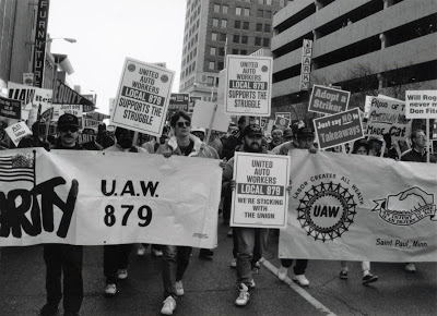 | Local 879, seen in this solidarity march in St. Paul, was a national leader during the 1980s and 1990s in promoting workers’ rights and fair trade. Image from the author’s collection. |